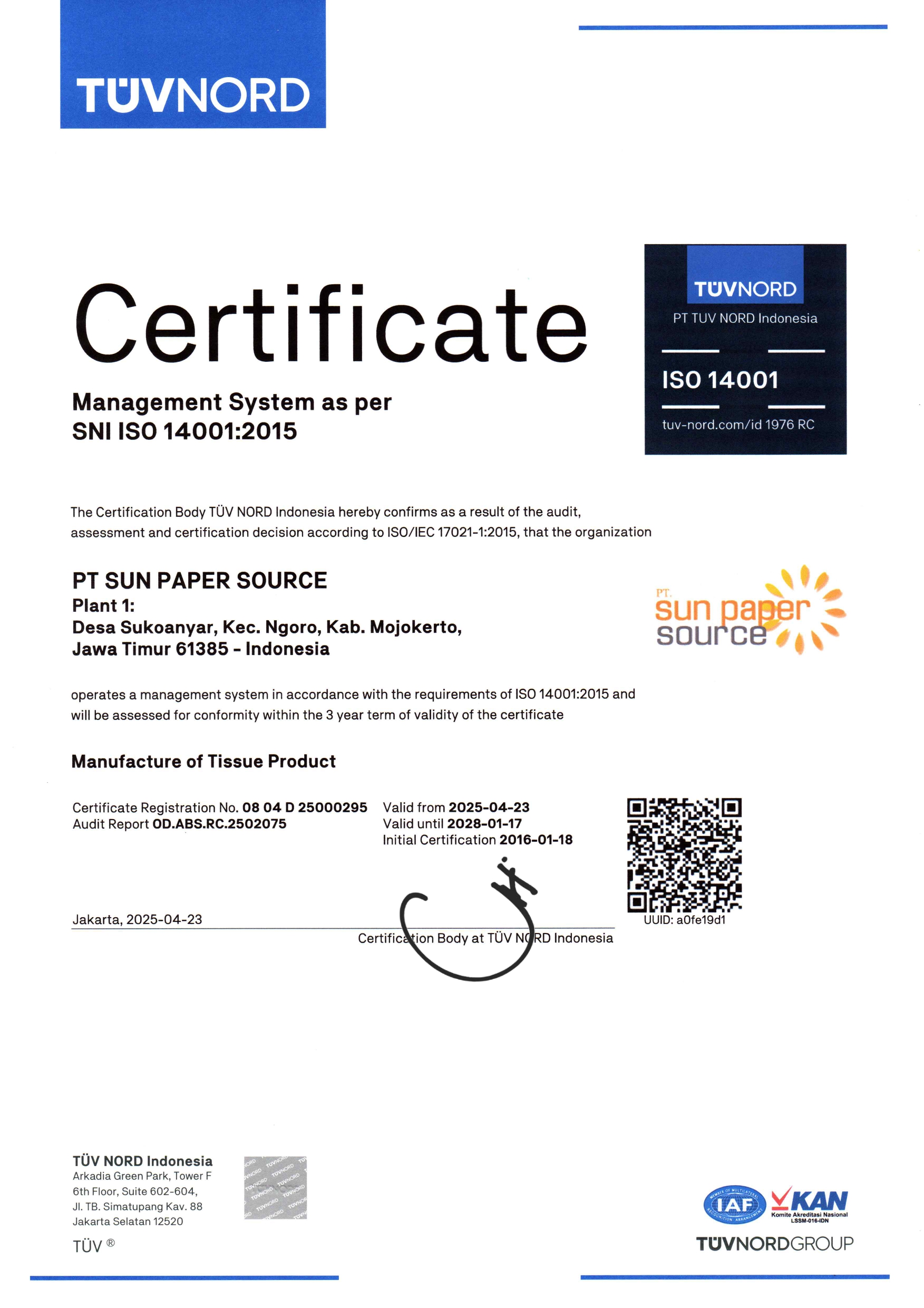 PT. Sun Paper Source is a leading tissue paper producer in Indonesia, which is located in Sukoanyar, East Java. It produces over 250.000 MT of tissue paper per year, including its sister company, PT. Sopanusa which is located just 8 kilometers away. Its expertise and experience that is gained throughout the years have made the group one of the largest tissue paper producers in South East Asia. There are currently six tissue machines onsite integrated with a converting facility to produce tissue paper in parent reels as well as finished paper products. As of today, the company exports the majority of its production capacity, serving customers in more than 80 countries across the world. PT. Sun Paper Source is committed to the development and diversification of its product by consolidating the operations of different companies, increasing the size and capacity of its production, and by joining hands with its affiliates to become a leading organization in the tissue industry.