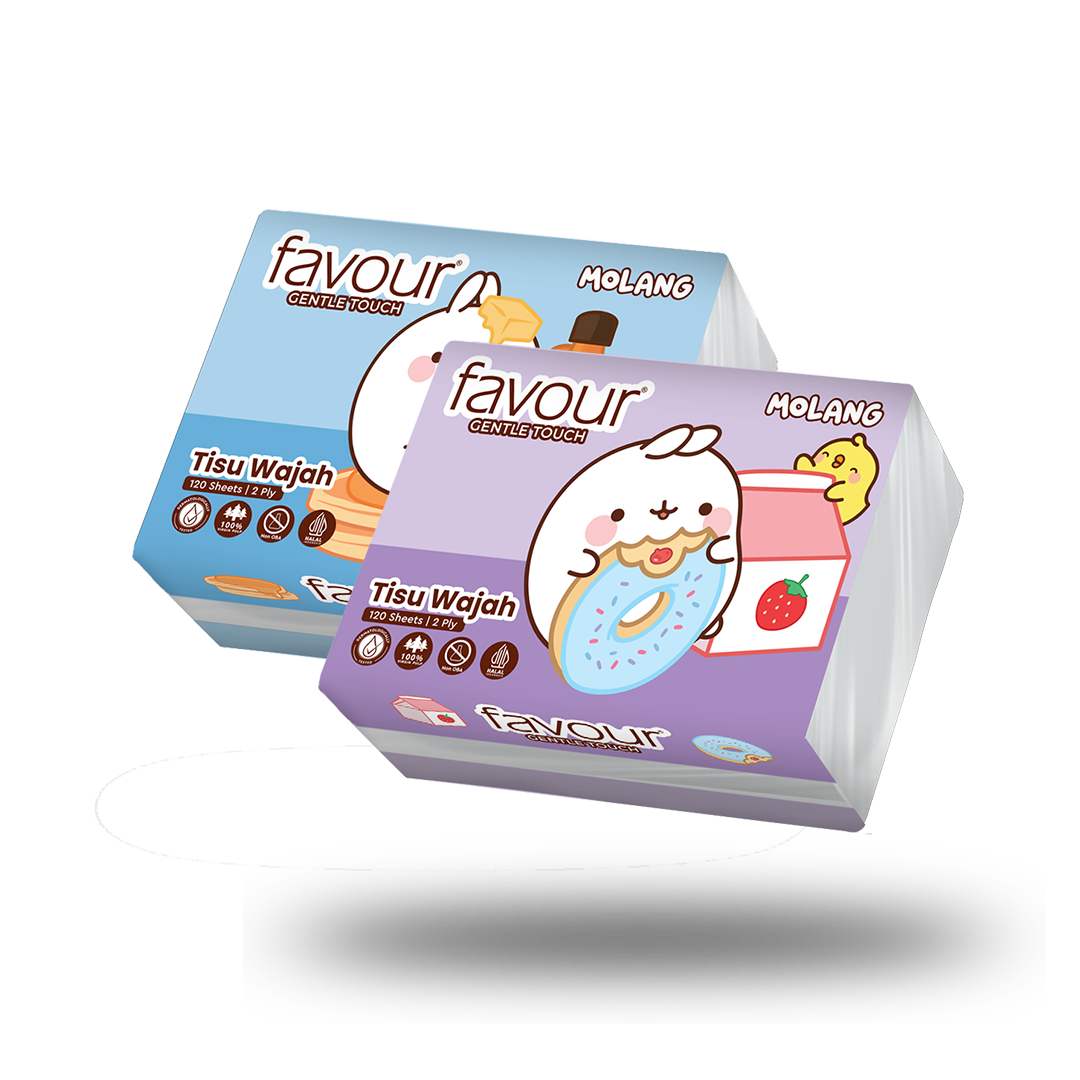 Favour Facial Tissue kini hadir dengan desain karakter Molang yang menggemaskan. Facial Mini Softpack Molang tissue isi 120 sheet ini memiliki 2 variant design dengan packaging bentuk softpack yang mini namun isi tetap banyak memudahkan untuk dibawa kemana saja. Cocok untuk semua jenis kulit karena telah teruji secara klinis serta mampu membersihkan area wajah, mulut, dan kulit tubuh dari keringat dan kotoran. Favour tissue cocok untuk semua jenis kulit karena telah teruji secara klinis.